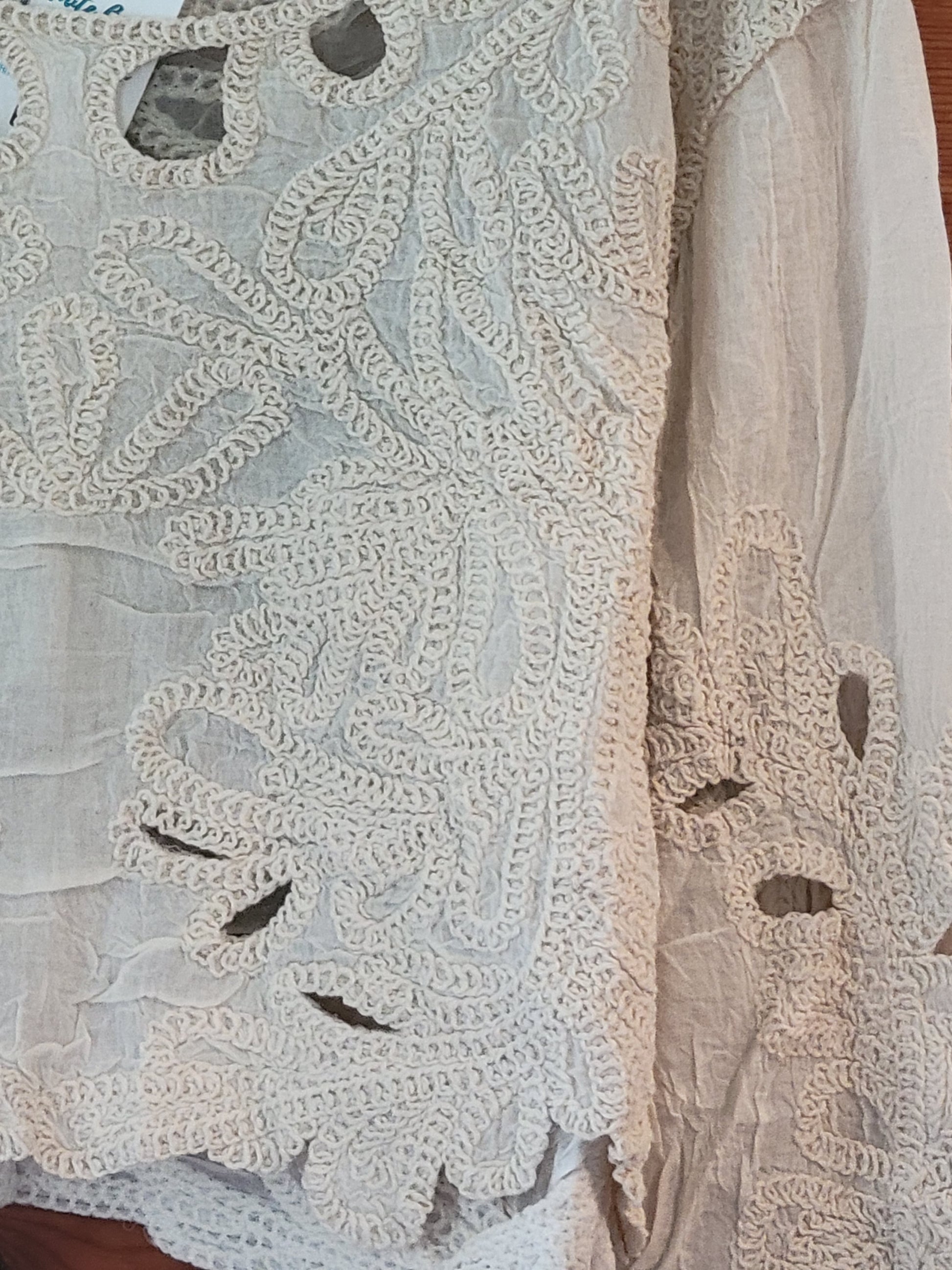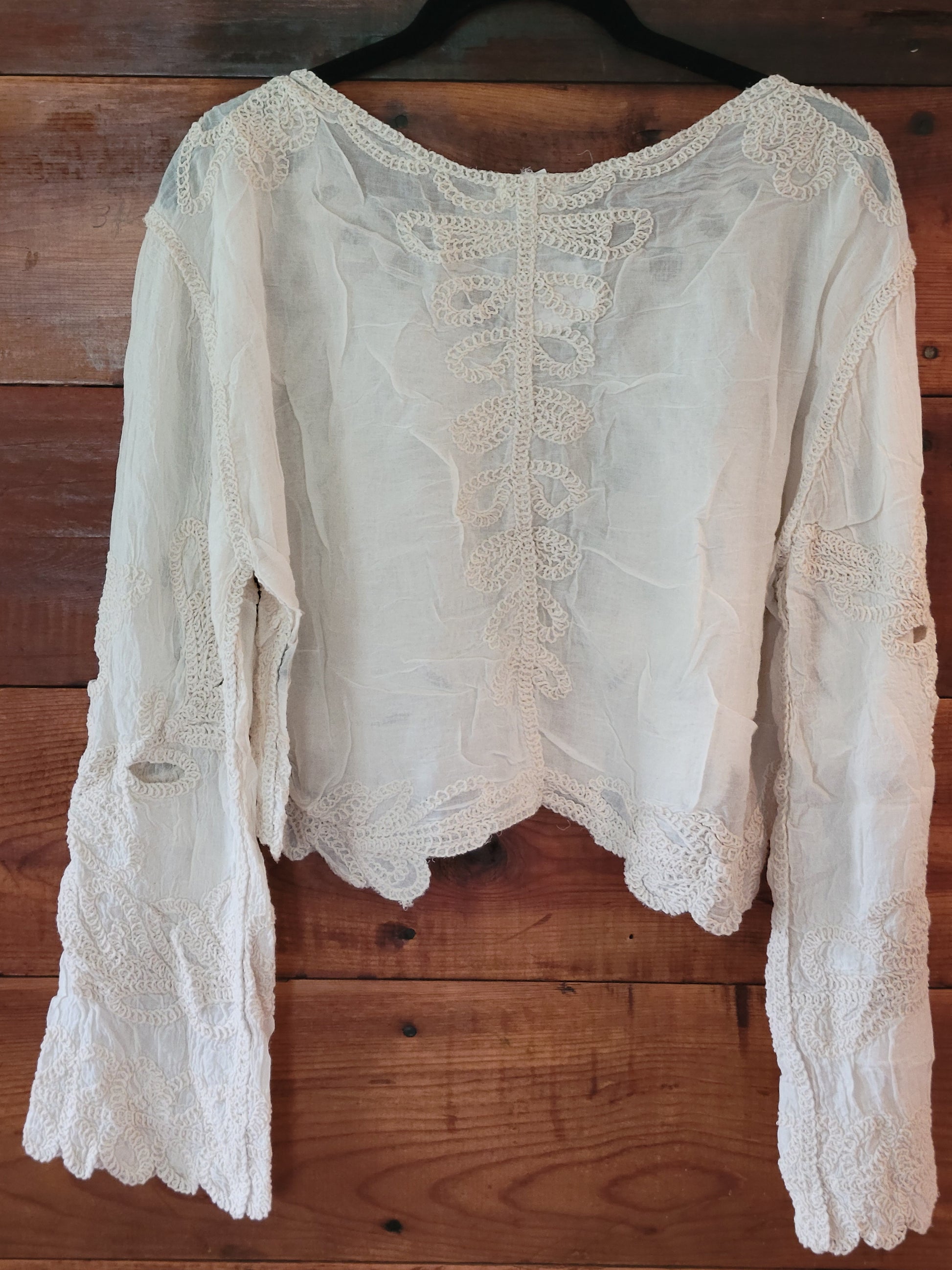 Embrace a breezy, playful vibe with this wide-neck, long-sleeve cropped top crafted in soft 100% cotton crochet. Detailed with delicate embroidery, it adds a charming touch to any outfit. With a comfortable bust of 19" and shoulder width of 17-3/4", it fits just right, while the 22" sleeves and 17" length keep things fun and flirty. Perfect for layering or showing off your favorite high-waisted bottoms on sunny days!