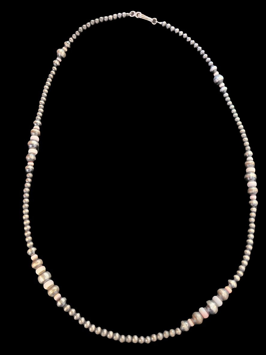 The Sterling Silver Navajo Pearls with beautiful light colored Cotton Candy Beads Necklace is a stunning addition to any jewelry collection. Made of high-quality sterling silver, this necklace features a unique Cotton Candy beads. Its versatile design allows for effortless styling, perfect for both standalone wear or layered with your favorite Navajo Pearls. Add this to your look with this timeless piece. 24"