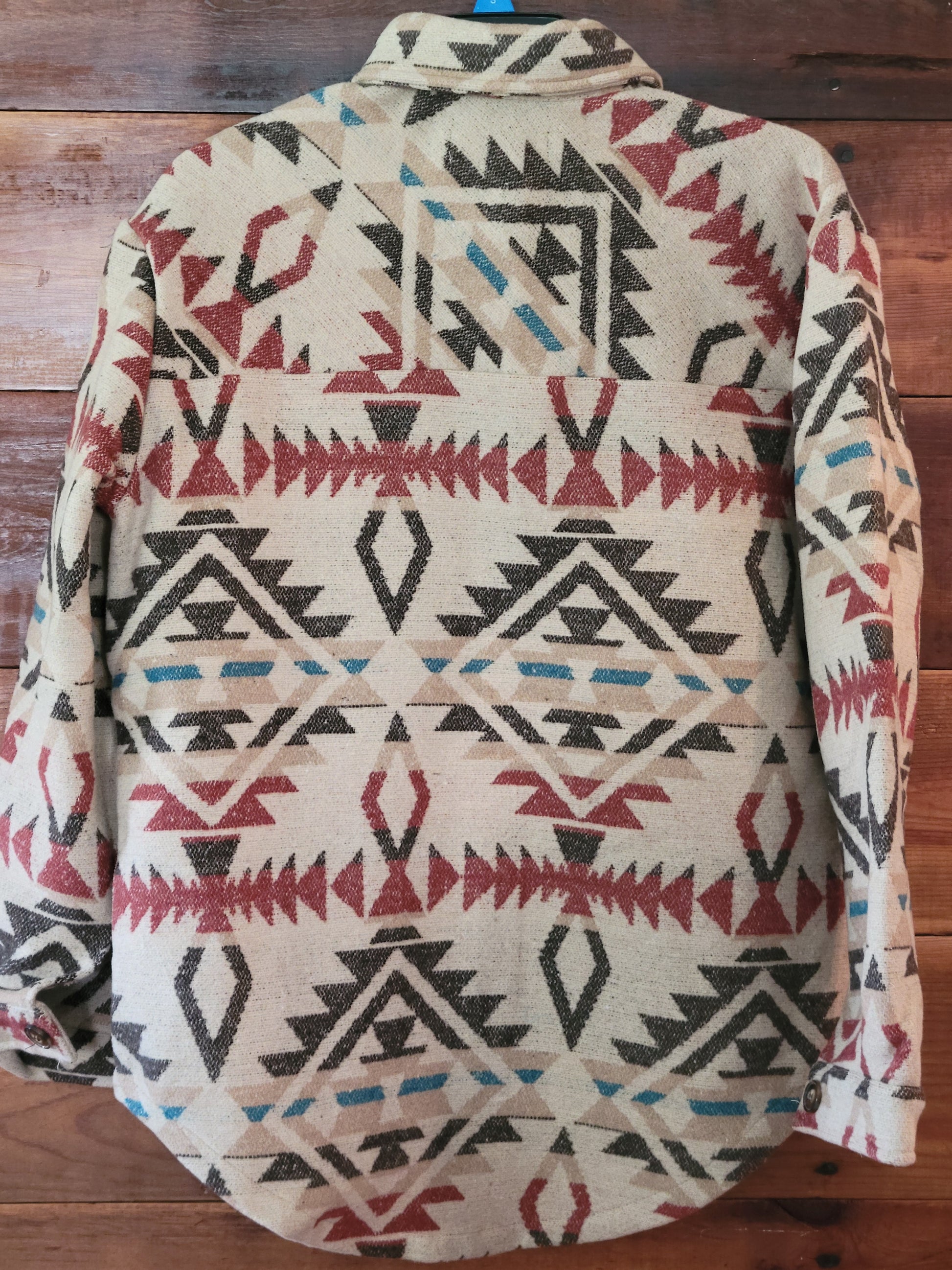 Cozy up in this playful Western-inspired shirt jacket, perfect for layering or wearing solo. Featuring a vibrant Aztec print in rich fall shades of brown, rust, cream, and turquoise, it adds a warm, stylish touch to your outfit. With handy pockets and just the right weight, it blends comfort and flair for your everyday adventures.