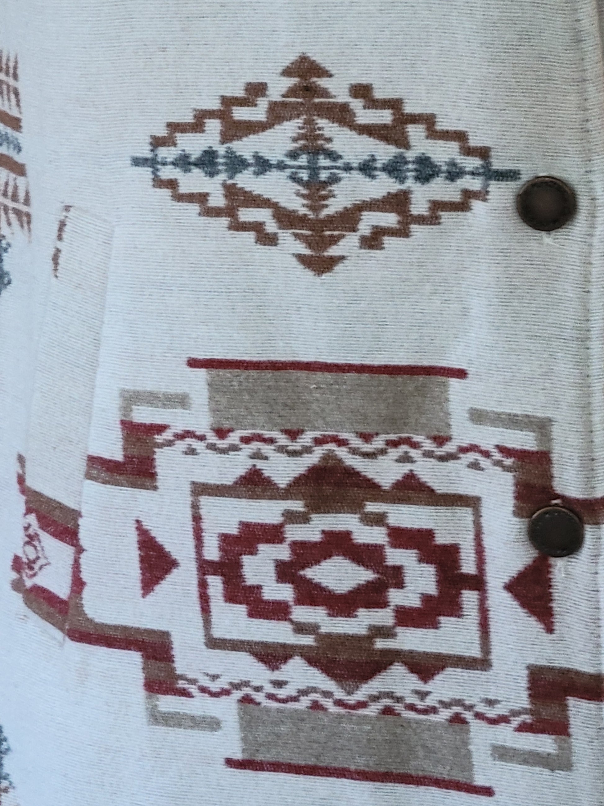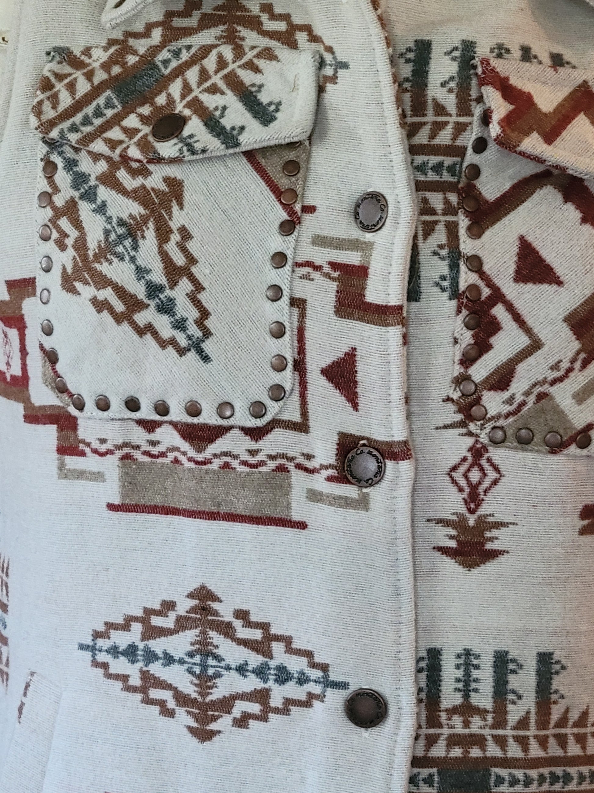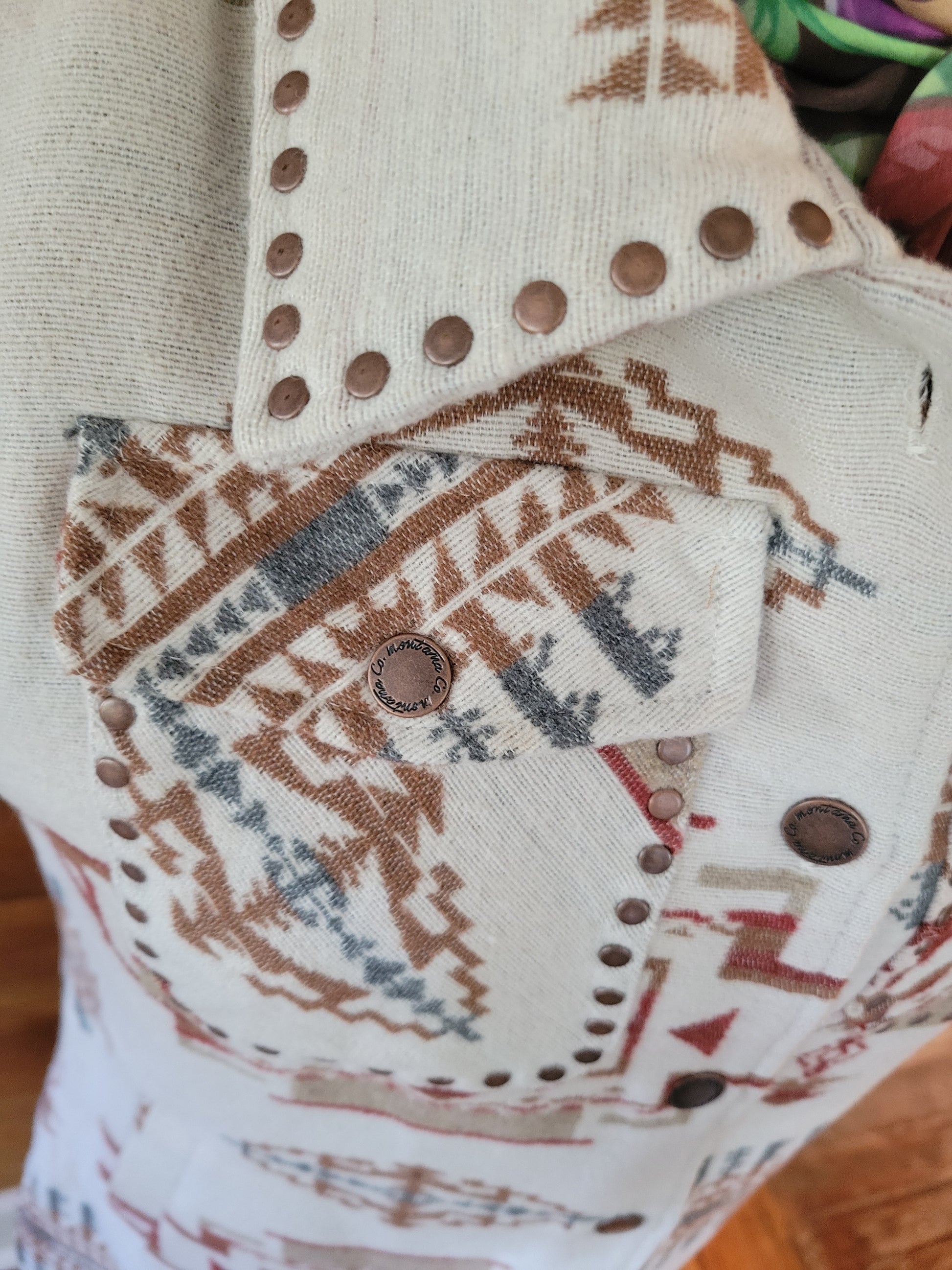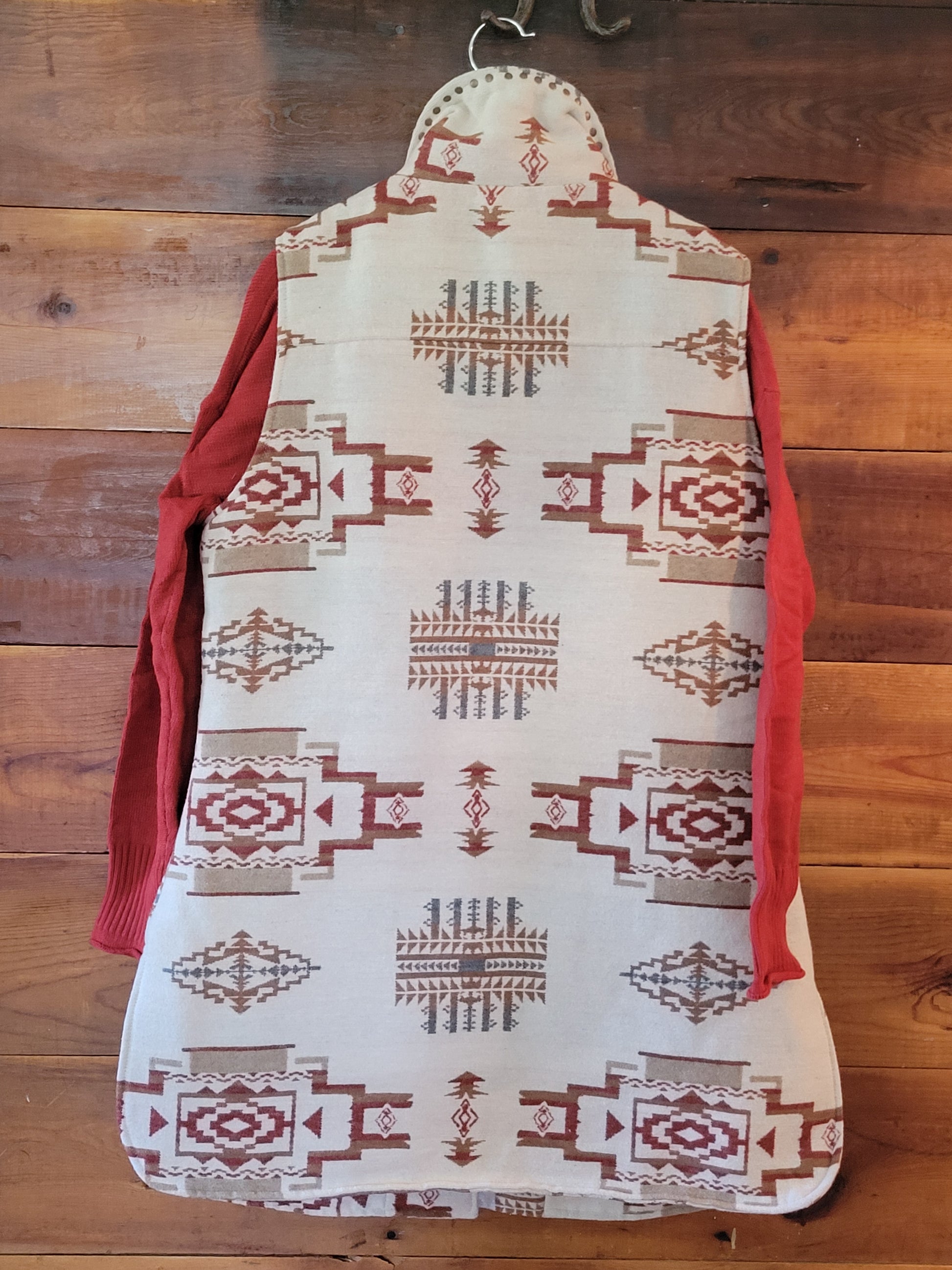 Turn heads with this playful long Aztec print vest featuring studded details on the collar and has pockets. Its rounded bottom and side slit offer easy movement, perfect for horseback rides or car trips. Lined for comfort, it showcases a charming palette of creams, neutrals, and dusty blue hues.
